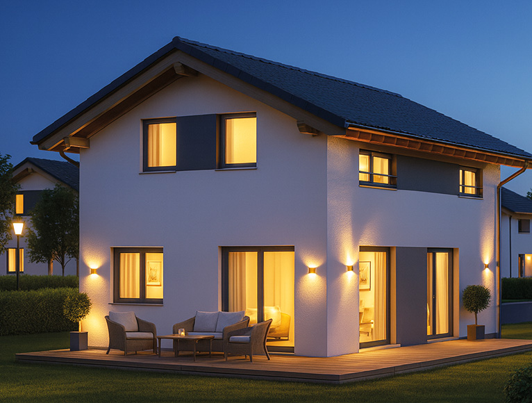 *Sowohl der Regnauer Standard-Kalkulation als auch den Aktionspreisen liegt das umfassende Leistungspaket der Regnauer Bauleistungs- & Ausstattungsbeschreibung zu Grunde. Alle Hauspreise ab Oberkante Kellerrohdecke, gültig für das Liefergebiet der Regnauer Fertigbau GmbH & Co. KG bis zu einer charakteristischen Schneelast von 2,5 kN/m2. Frischluft- Wärmetechnik ohne Kühlfunktion. Abbildungen mit Sonderausstattung. Alle Preisvorteile errechnen sich aus der Differenz zwischen Regnauer Standard- Kalkulation und Aktionspreis sowie dem Wert der Zugabe eines der drei Gratis-Gutscheine nach unverbindlicher Preisempfehlung des jeweiligen Herstellers und nach Vorgabe von Regnauer. Angebot nicht mit anderen Regnauer Aktionen kombinierbar. Eine Barauszahlung des Gutscheins im Wert von 10.000 € ist nicht möglich. Bei Entscheidung für das Smart-Home-Upgrade oder das Energie-Upgrade wird das Smart Home-Paket bzw. das Energie-Paket je nach Umfang individuell kalkuliert und der Gutschein im Wert von 10.000 € angerechnet. Nutzen Sie auch die Freiheit, Individualisierungen zur Umsetzung eigener Wünsche vorzunehmen. Welchen Einfluss das auf Ihren Vorzugspreis hat, sagt Ihnen Ihr Regnauer Berater. Für die Erreichung der KFN-Standards wird die entsprechende Ausführung der bauherrenseitigen Leistungen (z.B. Keller und -ausbau) vorausgesetzt.