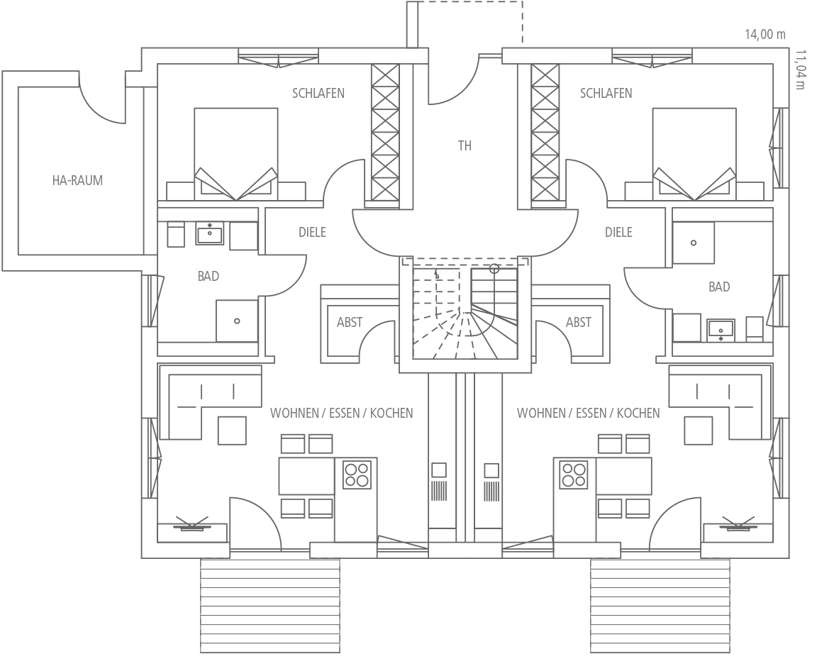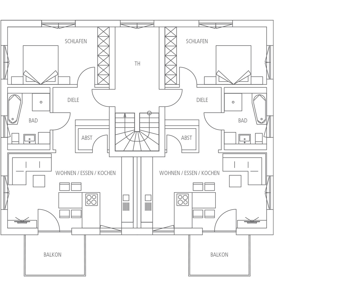 Das Highlight jeder der vier Wohnungen: der offene Wohn-/Essbereich mit integrierter Küche. Terrassen bzw. Balkone erweitern das Raumgefühl ins Freie. Im Erdgeschoss mit ansprechender Sichtschutz-Lösung. Ein geschickt eingeplanter Abstellraum nutzt Verkehrsfläche optimal. Im Bad finden Wanne und Dusche sowie die Waschmaschine Platz.
