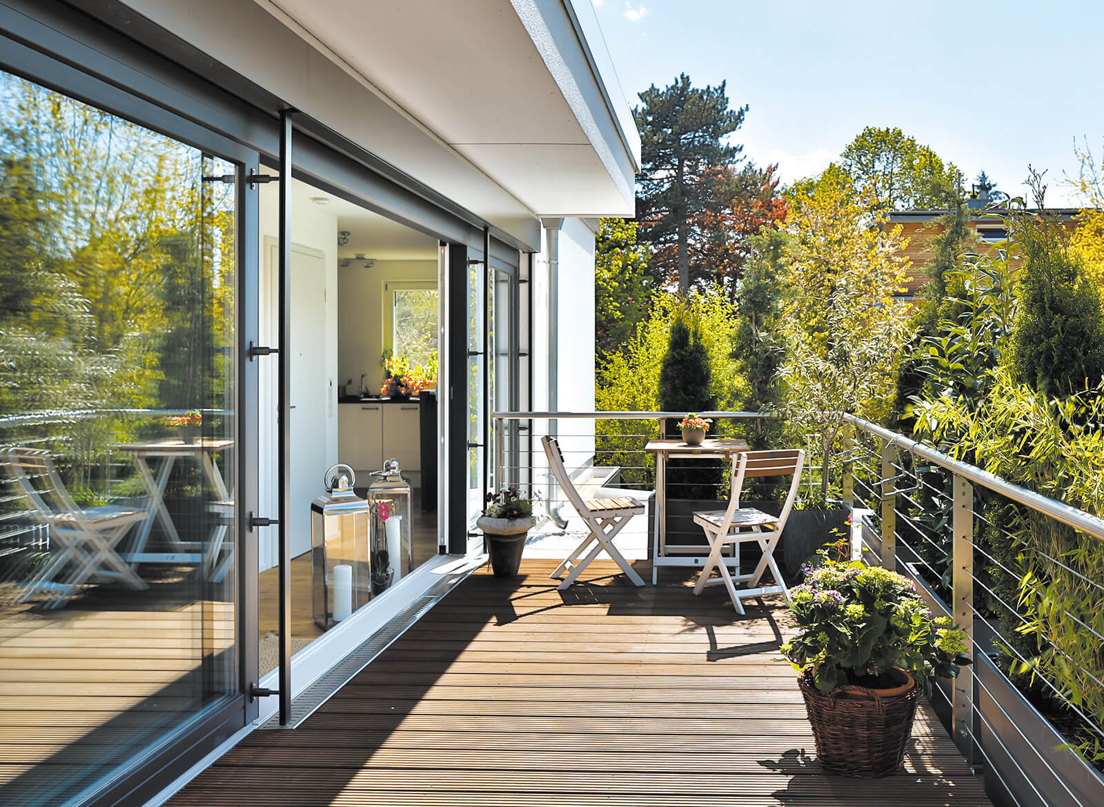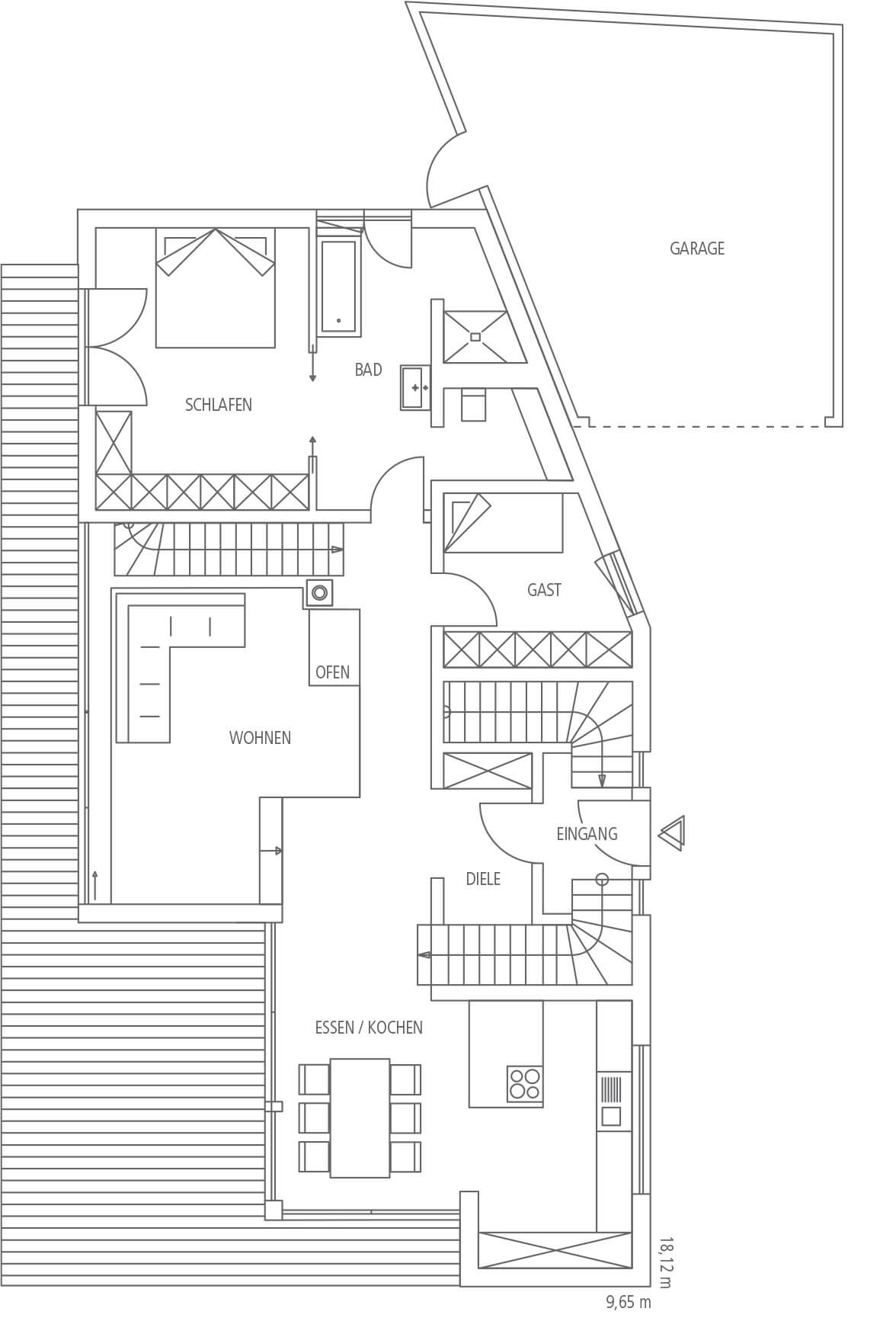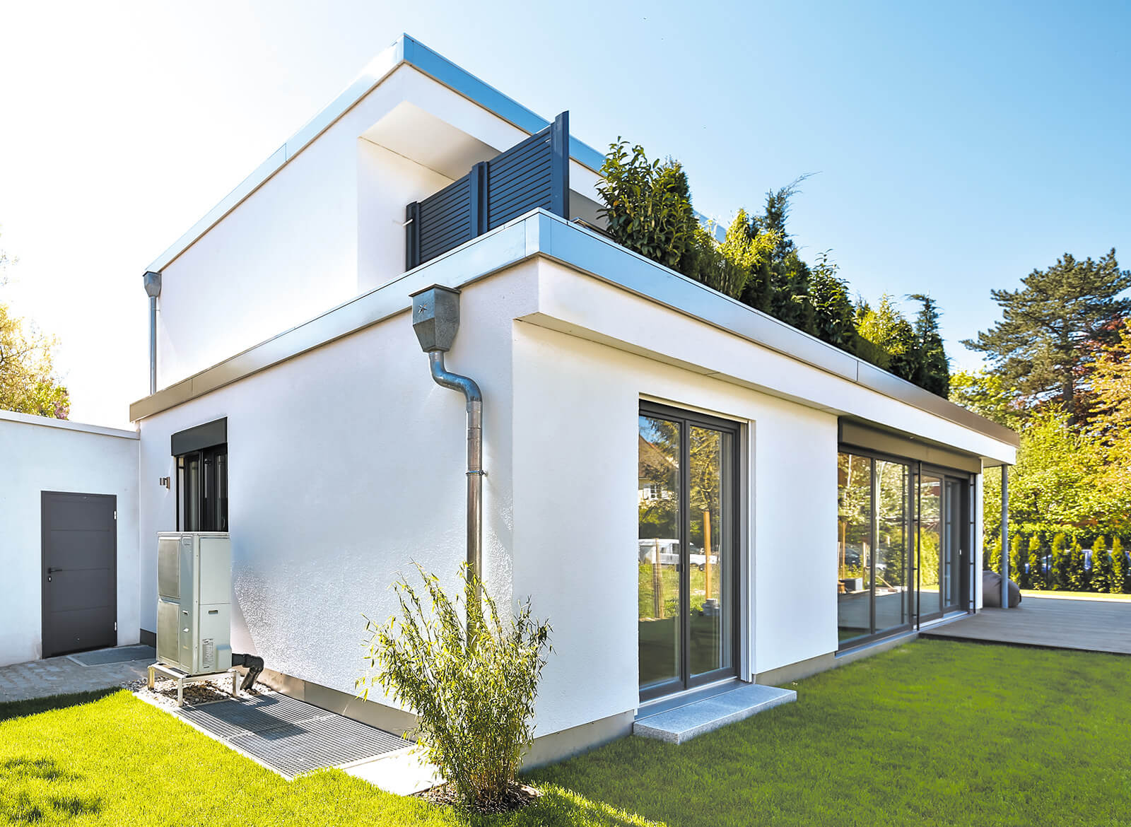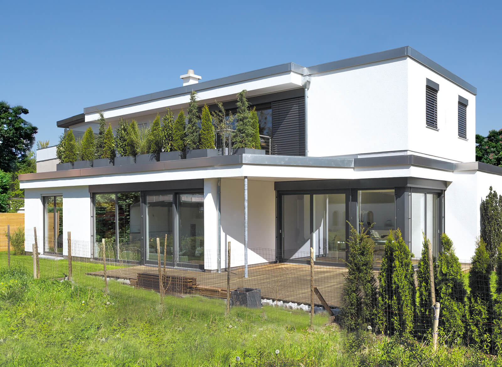 Dieses Vitalhaus in schnörkellosem Design besticht durch seine cleveren Raum- und Detaillösungen. Erdgeschoss und Obergeschoss bilden zwei voneinander unabhängige Einheiten. So wie die Bewohner unten die Vorzüge einer großen Terrasse genießen, erweitert oben ein Dachbalkon mit trittsympathischem Holzboden den Wohnraum nach draußen. Bepflanzungen vor dem Balkon machen ihn fast schon zum Dachgarten und geben beiden Parteien Privatsphäre.