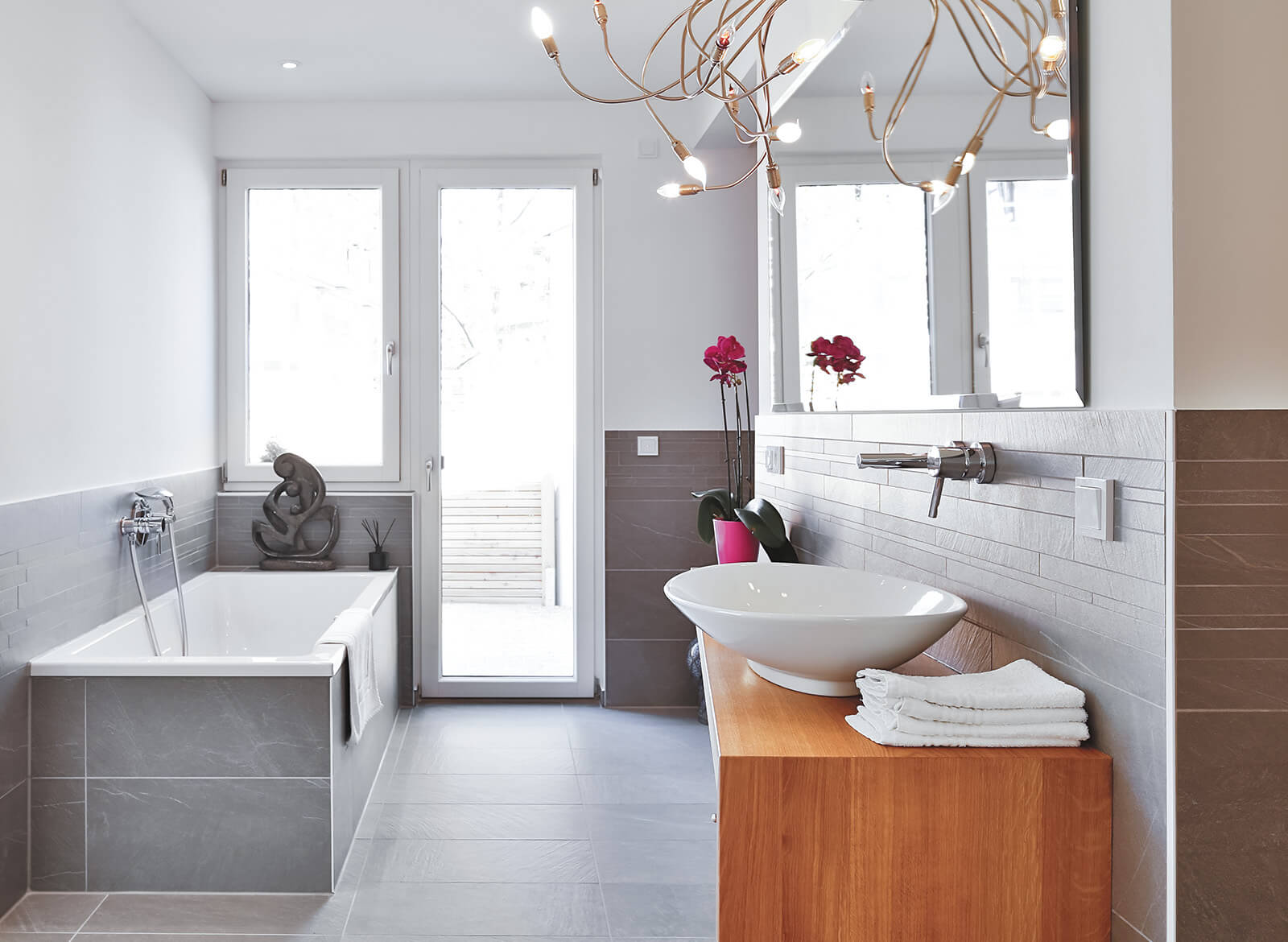 Weiße Flächen und Glas, Klarheit und Geradlinigkeit prägen das Äußere – innen findet sich Wohlfühlatmosphäre durch stimmige Gestaltung und bewusste Materialwahl. Dabei spielt Holz eine zentrale Rolle.