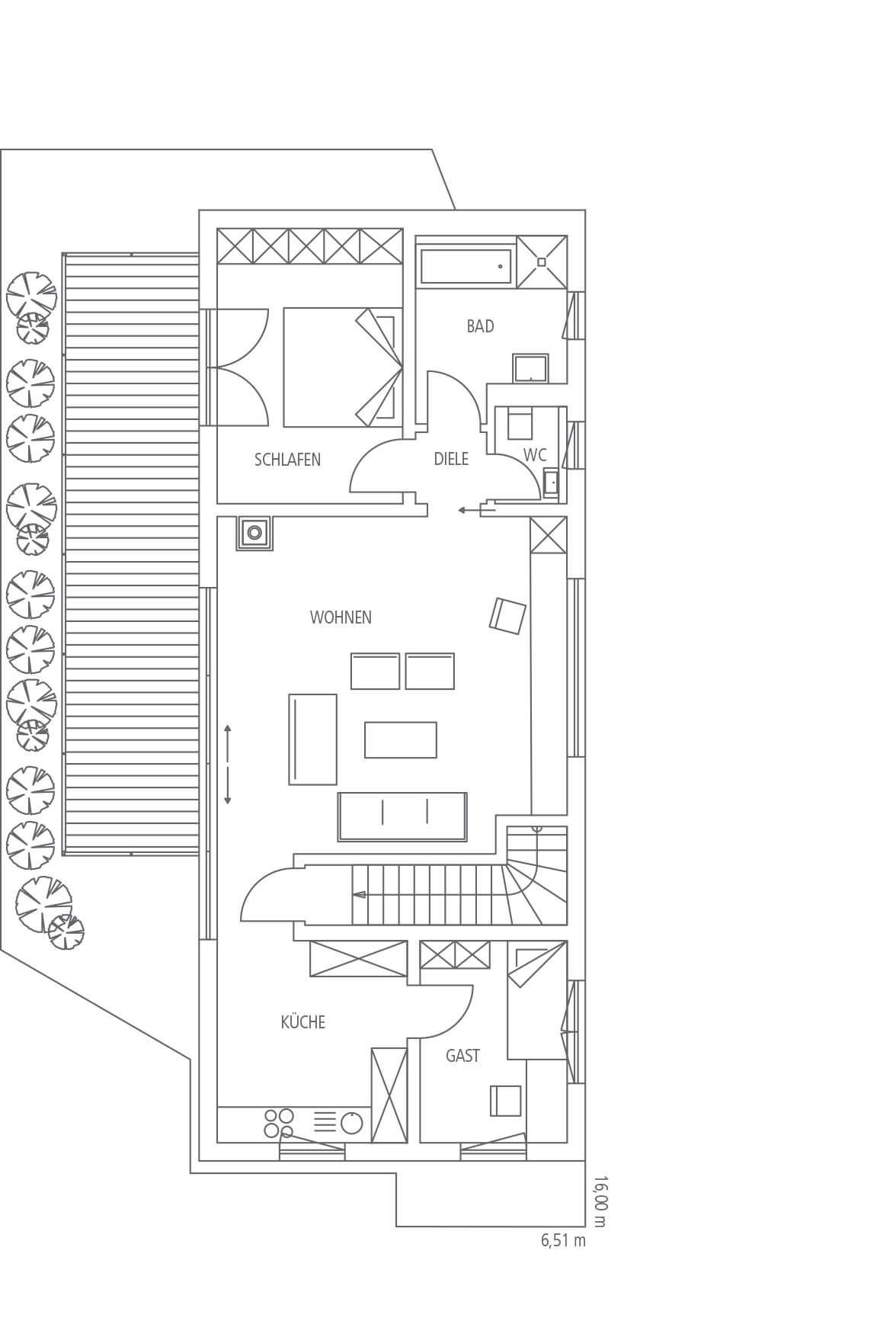 Im Erdgeschoss ist der Übergang zwischen Diele und Wohnzimmer als Split-Level realisiert. Über zwei Stufen tauchen die Bewohner förmlich ein in den Rückzugsbereich, lassen den Alltag hinter sich, finden Ruhe.