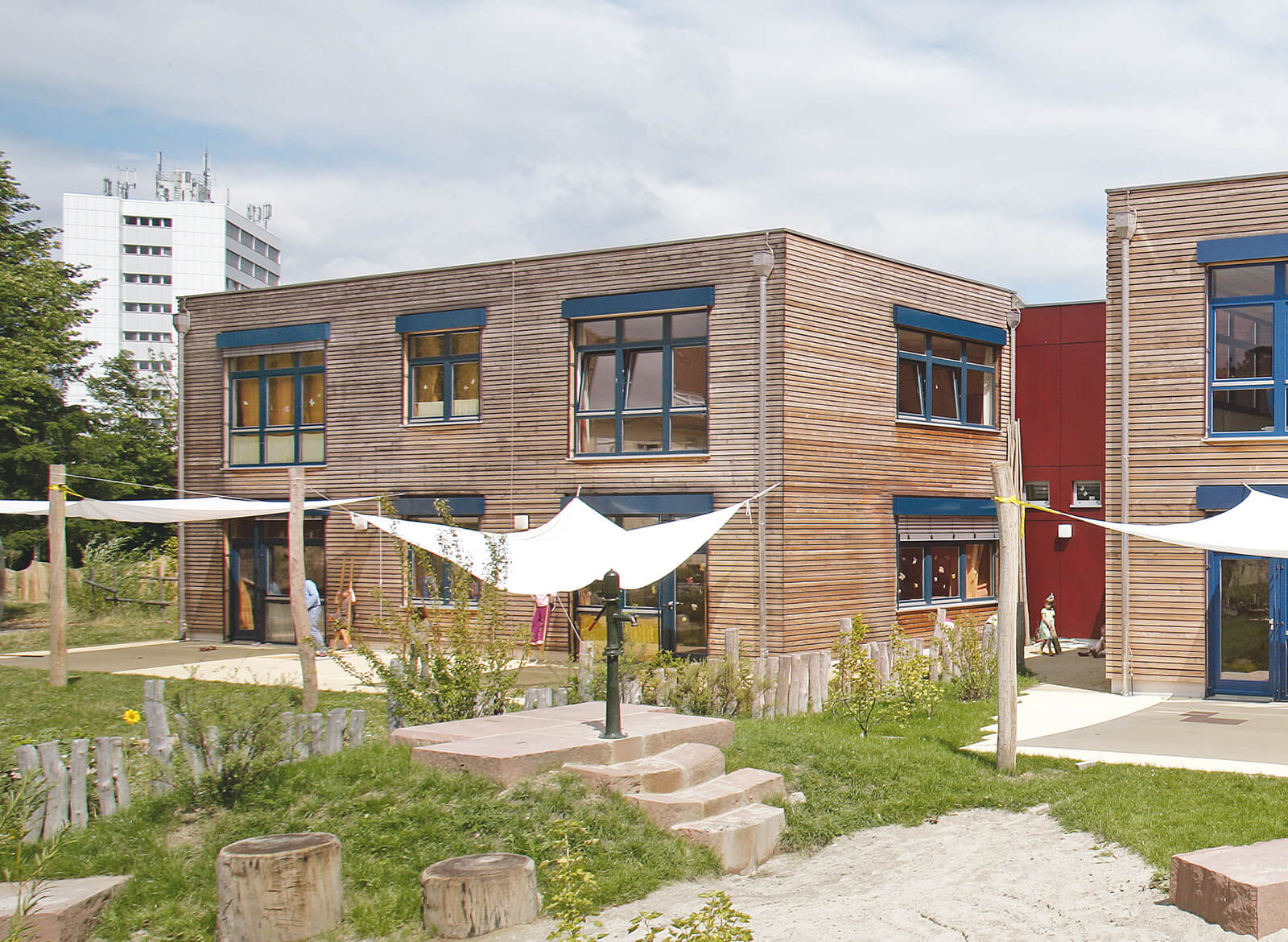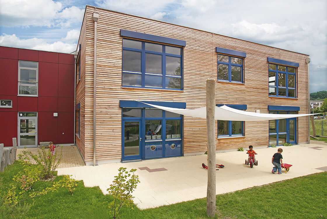 Der Freiburger Vorzeigestadtteil Vauban hat ein Schmuckstück aufzuweisen: Auf dem Gelände einer ehemaligen Kaserne entstand ein Kindergarten, der sich durch seine attraktive und wirtschaftliche Holzfertigbauweise perfekt in die "Holzbausiedlung" fügt. Das günstigste Angebot war in diesem Fall auch das architektonisch beste: Mit einer finanziell und konzeptionell überzeugenden Lösung. Geschaffen wurde ein Kindergarten mit zwei baugleichen Baukörpern, in dem insgesamt sechs Kindergruppen Platz finden.